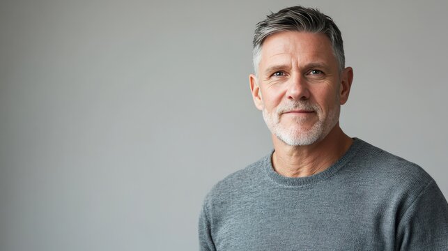Confident Middle-Aged Man with Gray Hair in Casual Attire Against a Neutral Background