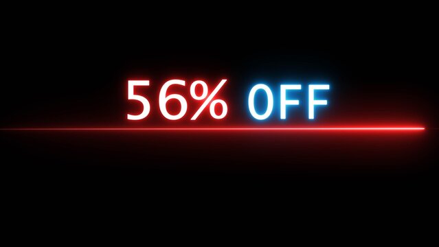 Neon 56% off animation.  Neon discount percentage offer animation. Neon text number animation on black background.
