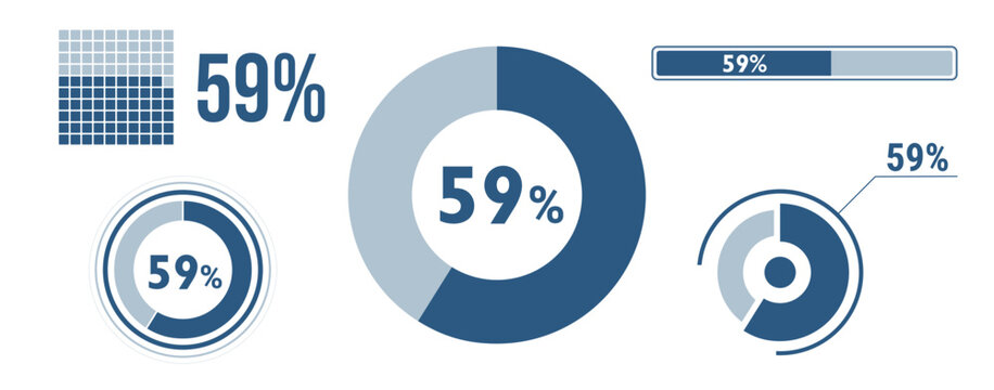 59% percentage infographic set. Fifty-nine circle diagram, pie donut chart, progress bar. 59 percent loading data icon. Vector concept collection.