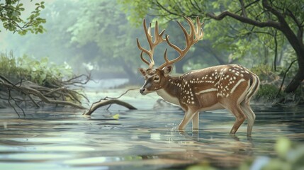 5d water color sketch of a spotted deer in the river, the water is clear and clean, the trees are green arount it realist, uhd, 16k.