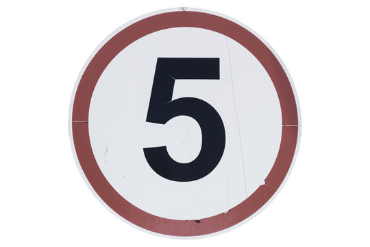 Old road sign 'Speed limit 5 km/h' isolated on white