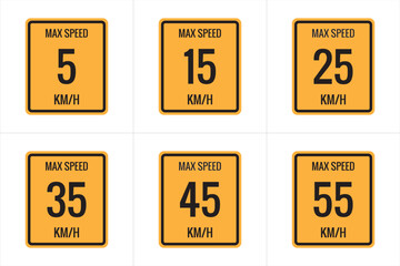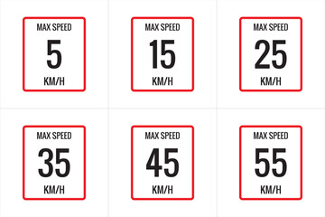 Maximum Speed limit sign 5 kmh, 15, 25, 35, 45, 55 Kmh, sign icon on white background vector illustration.