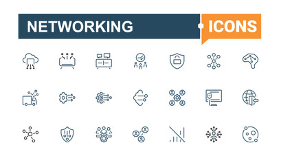 Set of Networking line icons. Featuring cyber, computing, tech, meeting, contact and more. Thin outline icons pack. Editable stroke. Vector illustration.