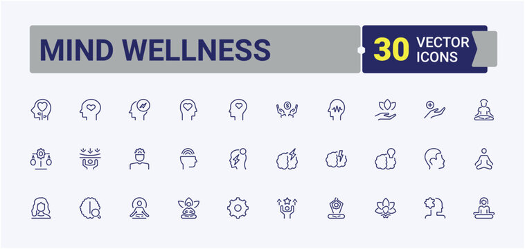 Mind Wellness icon collection. Contains related to treatment, 5on, relaxation, eco, medicals, meditation and more. Simple line vector. Editable stroke. Vector illustration.