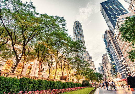 Tourists relax on 5th Avenue near Public Library on a spring evening, May 17, 2013 in NYC. Fifth Avenue has the world's most expensive retail spaces as the symbol of wealthy New York