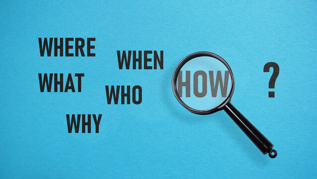 Hand stacking wooden blocks with text - How, Why, What, When, Where, Who. Fact finding concept