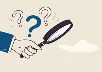 Businessman looking through magnifying glass searching. Thinking of who what where when why and how. 5w1h asking questions for solution to solve problem, business analysis to new idea.