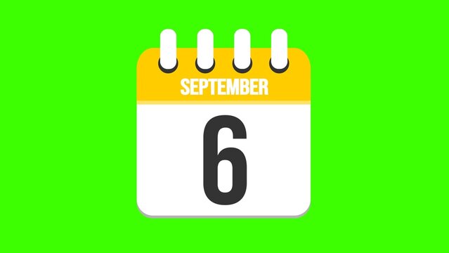 September 6. Cartoon style calendar. Cartoon style calendar with date and month name on green chroma key background. 4k.