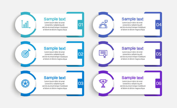 Infographic template. 6 connected squares with icons