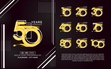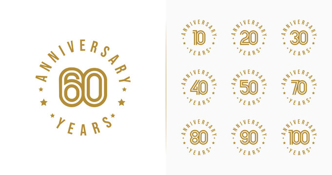 Set of anniversary logo design. 10, 20, 30, 40, 50, 60, 70, 80, 90, 100, birthday symbol with luxury style