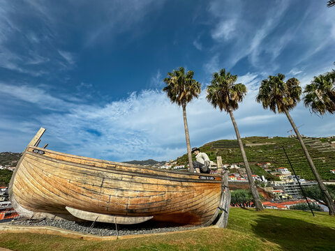 Monument to celebrate Madeira 600th anniversary next to large palm trees in charming fishermen village of Camara de Lobos, Madeira island, Portugal, Europe. Colourful houses on steep hills and cliffs