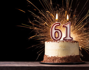 Birthday cake with 61 year old birthday candle on dark background with bokeh and sparklers. Copy space