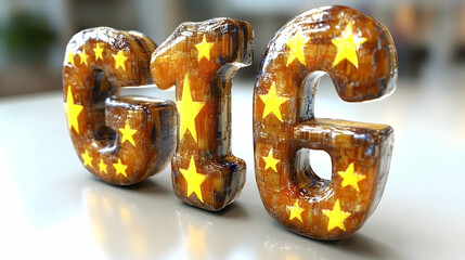 3D Number 616 Decorated with Embossed Stars on a Reflective Surface