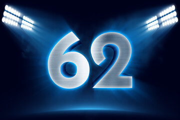 Number 62 background, 3D 62 object made of metal, illuminated with floodlights