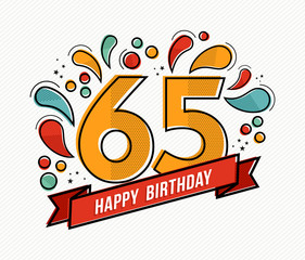 65th birthday card. Vibrant and colorful birthday celebration, featuring a large cake with the number 65 on it, surrounded by balloons and gifts.