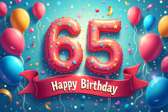 Vector Sets of 65th Years Birthday invitation, greeting card Design, with confetti and balloons, birthday cake, Colorful Vector template Elements for your Birthday Celebration Party.