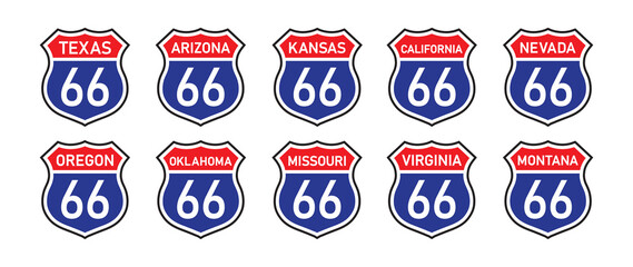 Route 66 Verkehrszeichen aus USA / Amerika mit allen betroffenen Staaten in historic Design auf einem isolierten weißen Hintergrund
