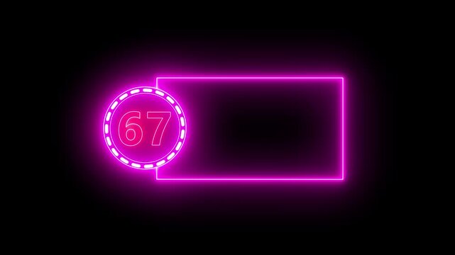 Neon Number 67 In Circle With Rectangular Frame On Black Background.Neon number text animation with alpha channel.Colorful circle on Black background 4k video.