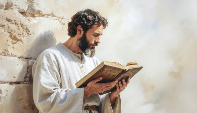 Pastel drawing artistic image of an excited jew from the 6th century, holding a big vintage book.