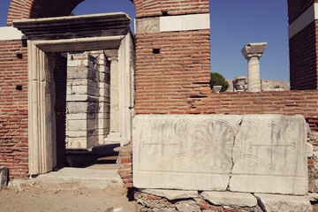 christian crosses engraved into stone at the 6th century ruins of Basilica of St. John, town of Selcuk, Turkey