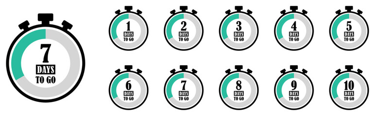 Countdown timer number of days left with stopwatch. Countdown timer with stopwatch showing days remaining from 1 to 10, time management and deadline reminder for scheduling and planning. Days Left.