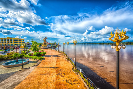 Khong Chiam District Ubon Ratchathani, Thailand - March 5, 2023: Silver Naga and Golden Naga creeping up from the mouth of the cave at the Tham Pharaiya Temple