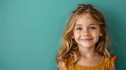 A cheerful Gen Alpha girl around 7 years old with wavy blonde hair