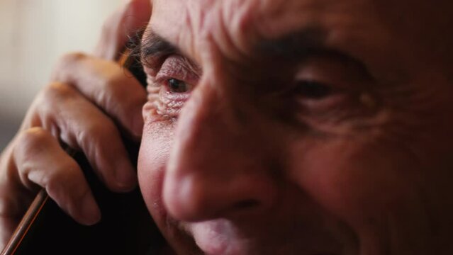 portrait of a cheerful Caucasian pensioner 70 -79 years old talking on the phone. emotions of older people. cheerful pensioner jokes while talking on the phone