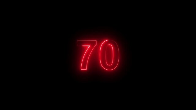 70 number countdown neon bright red color animation. black background 4k video.