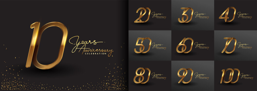Set of anniversary logotype design with handwriting golden color for celebration event, wedding, greeting card, and invitation. Vector illustration.