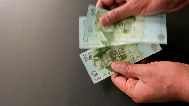 Man counting Pakistan 75 rupees commemorative banknotes