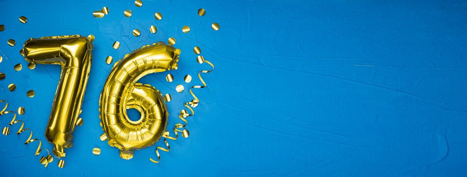 golden yellow foil balloon on blue concrete background number seventy six. Birthday or anniversary card with 76 inscription. Anniversary celebration.
