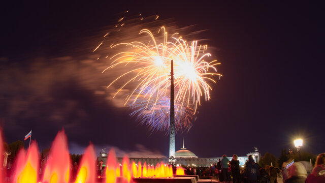 Festive salute in Victory park in honor of the 76th anniversary of the Soviet victory in the Great Patriotic War. Moscow, Russia - May 9, 2021.