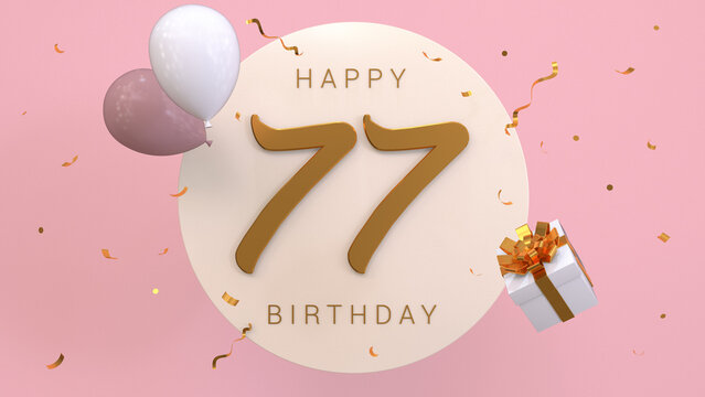Happy Birthday Wishes To The Birthday Boy - Personalised With Number - Funny Birthday Card - With White Balloons - 77 Years Greeting Postcard - Illustration Anniversary Banner Ribbon.