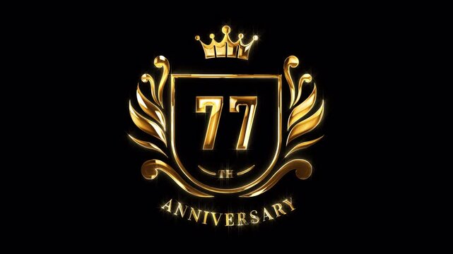 77th Anniversary Celebration. Happy 77 Years Anniversary Animation in Gold Color on the Transparent Background, Alpha Channel. Great for greetings, celebrations, events, and gifts.