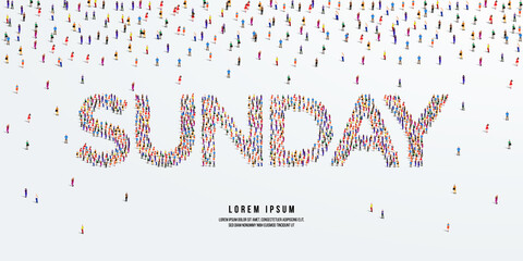 Word Sunday. Large group of people form to create the word Sunday. Vector illustration.