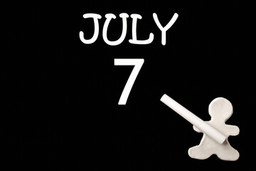 A small white plasticine man writing the date 7July on a black board. Business concept. Education concept.
