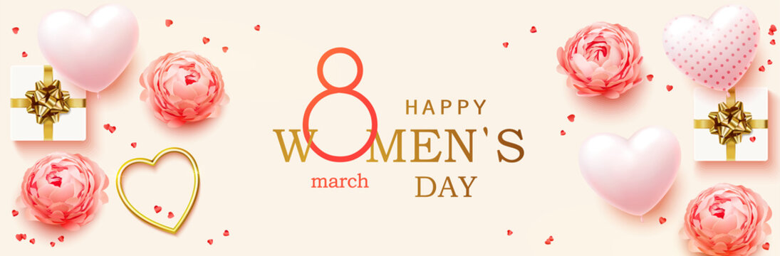 8 March. Women's Day horizontal banner for the website. Postcard on March 8. Romantic background with realistic design elements, gift box, golden hearts, balloons in the shape of heart and flowers