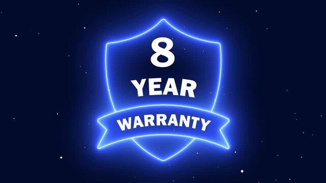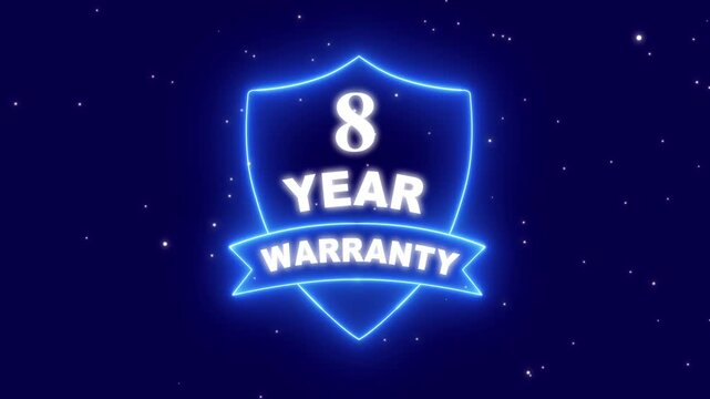 Glowing blue neon shield emblem with ribbon stating 8 year warranty against a dark blue starry background