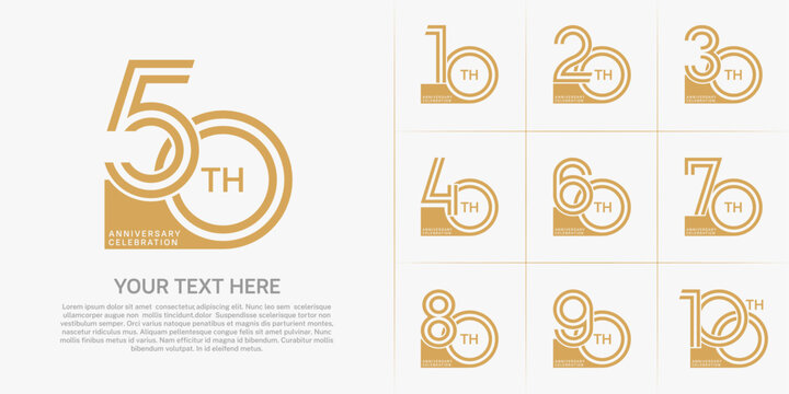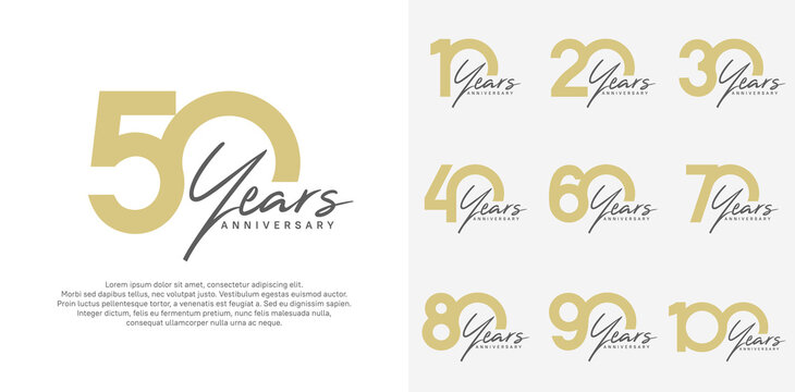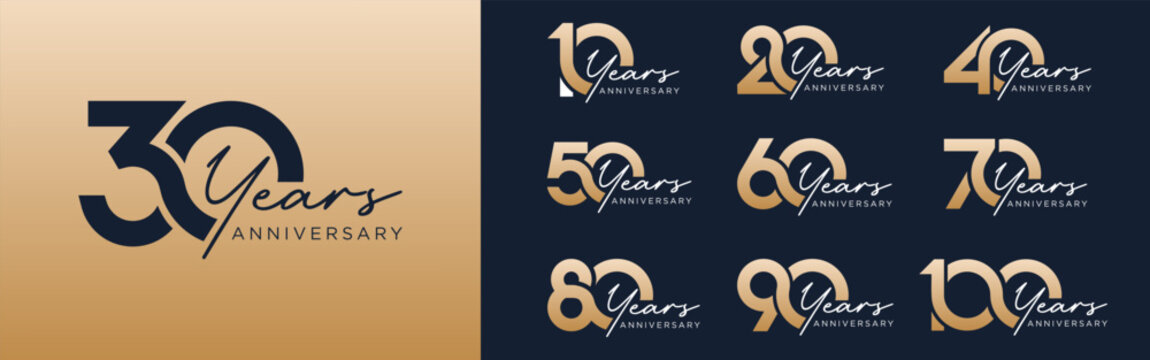 collection of 10 to 100th anniversary logotype design, with golden color for celebration event, wedding, greeting card, and invitation, vector illustration