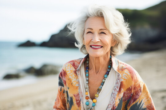 Portrait in the beach of a pleased 80 years old woman.