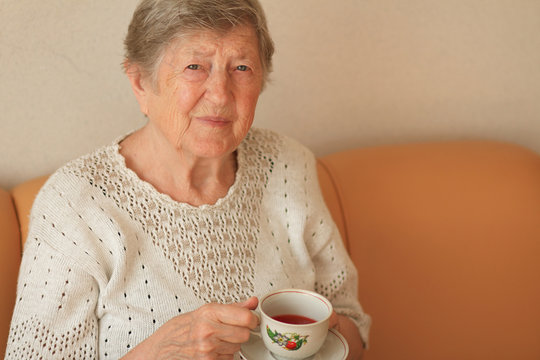 Elderly woman with cup of tea