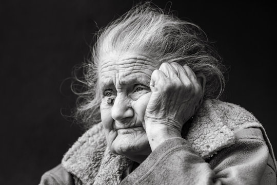 Very old and tired wrinkled woman outdoors