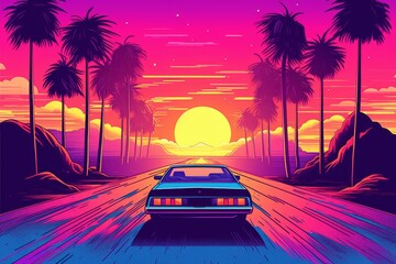 Summer vibes 80s style illustration with car driving into sunset. Generative AI 3