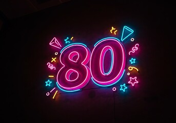 Neon sign celebrating 80th birthday with party symbols