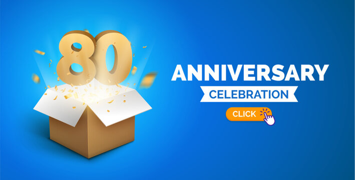 Anniversary birthday 80 years golden background. Happy vector poster 80 anniversary box confetti celebration poster.