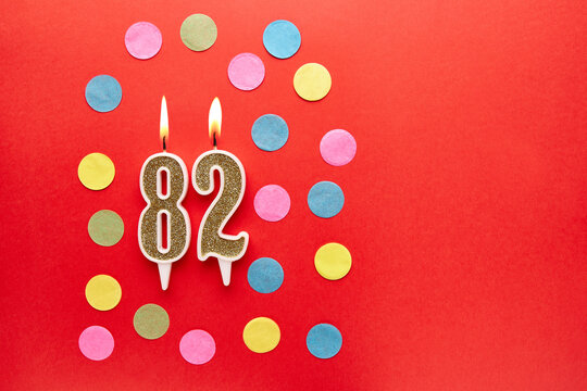 Number 82 on a red background with colored confetti. Happy birthday candles. The concept of celebrating a birthday, anniversary, important date, holiday. Copy space. banner