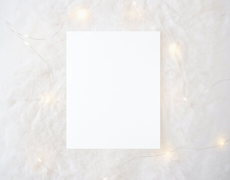 Blank white paper on isolated white cozy background with string lights, minimalist, Christmas, holiday