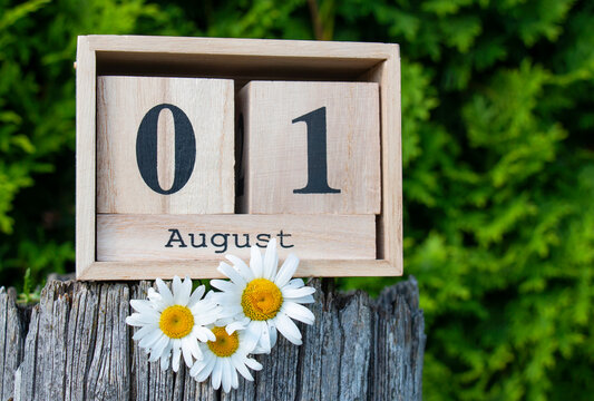 wooden block of the calendar is present 1 and the month of August amid the greenery of about three daisies