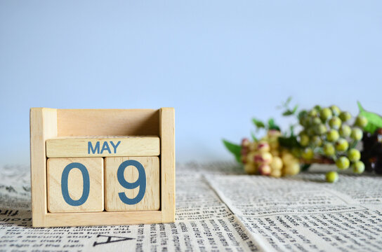 May 9, Calendar cover design with number cube with fruit on newspaper fabric and blue background.
